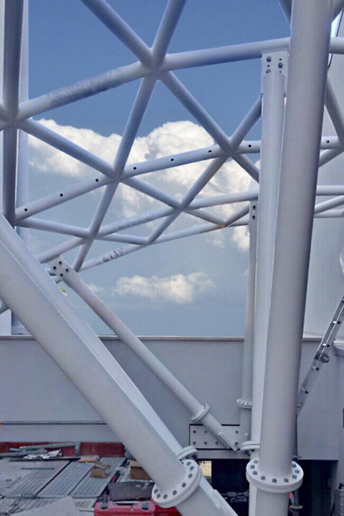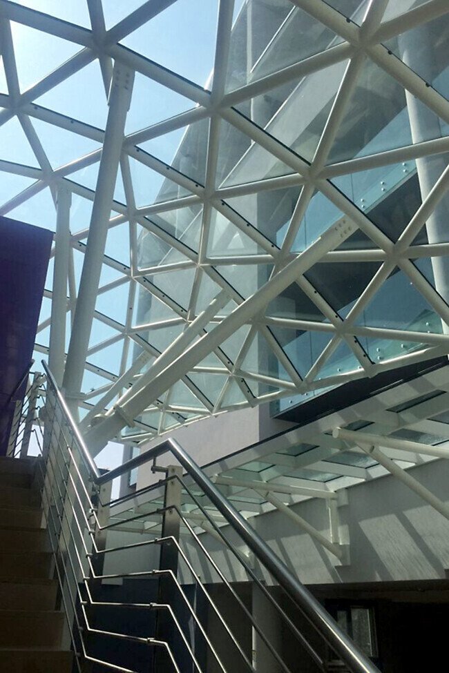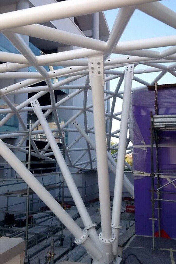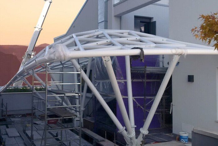 Realizzazione di una cupola in acciaio con tubolari circolari, caratterizzata da specchiature di dimensioni variabili. Il vetro è fissato alla struttura tramite profilo Schüco AOC con agganci personalizzati in acciaio inox. Il progetto è stato realizzato secondo le specifiche dell’architetto.