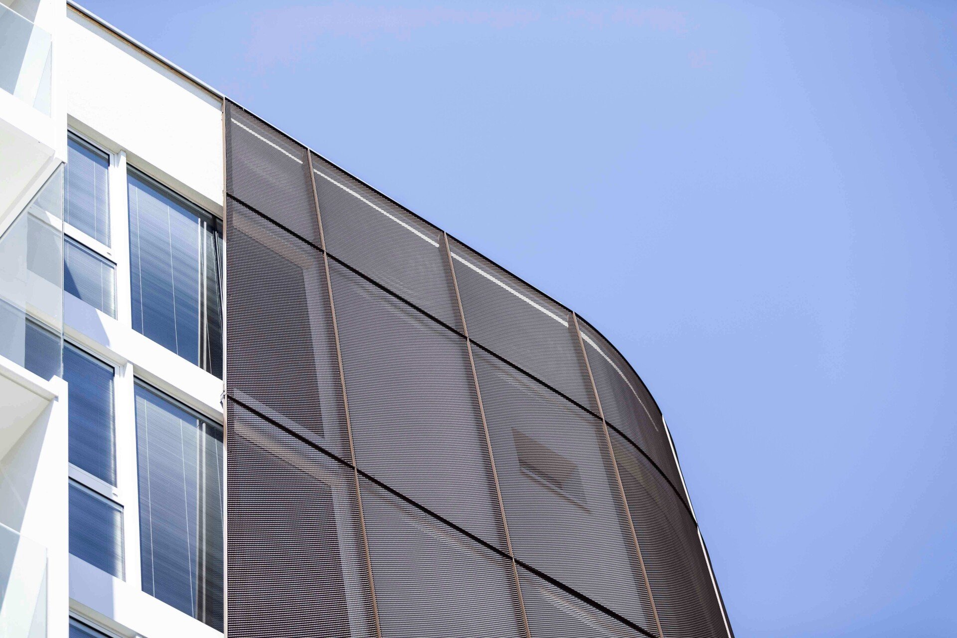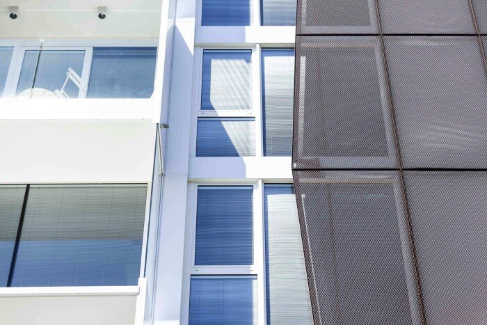 Fornitura e realizzazione di una facciata in alluminio rivestita in lamiera stirata con finitura corten, per edificio residenziale in Ticino.